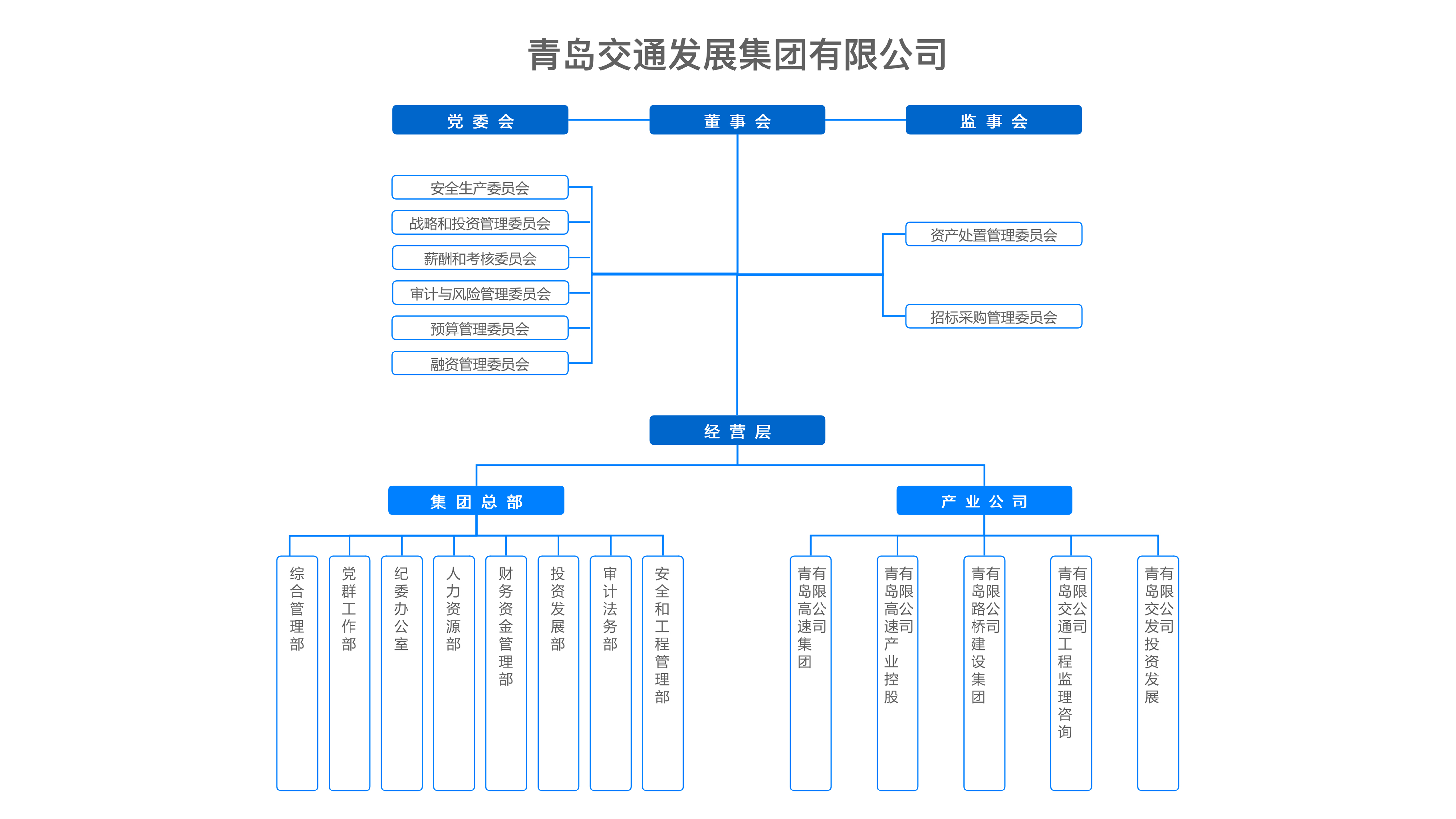 青島交通發(fā)展集團(tuán)有限公司(以下簡(jiǎn)稱“交發(fā)集團(tuán)”)成立2012年5月,注冊(cè)資本10億元,定位為青島市交通建設(shè)投融資主體,負(fù)責(zé)所轄高速公路等交通基礎(chǔ)設(shè)施的運(yùn)營(yíng)、養(yǎng)護(hù)、管理工作和投融資建設(shè)任務(wù),承擔(dān)青島市未來高速公路發(fā)展和交通基礎(chǔ)設(shè)施建設(shè)投融資等職能?,F(xiàn)有所屬二級(jí)企業(yè)18戶,干部職工2100余人。